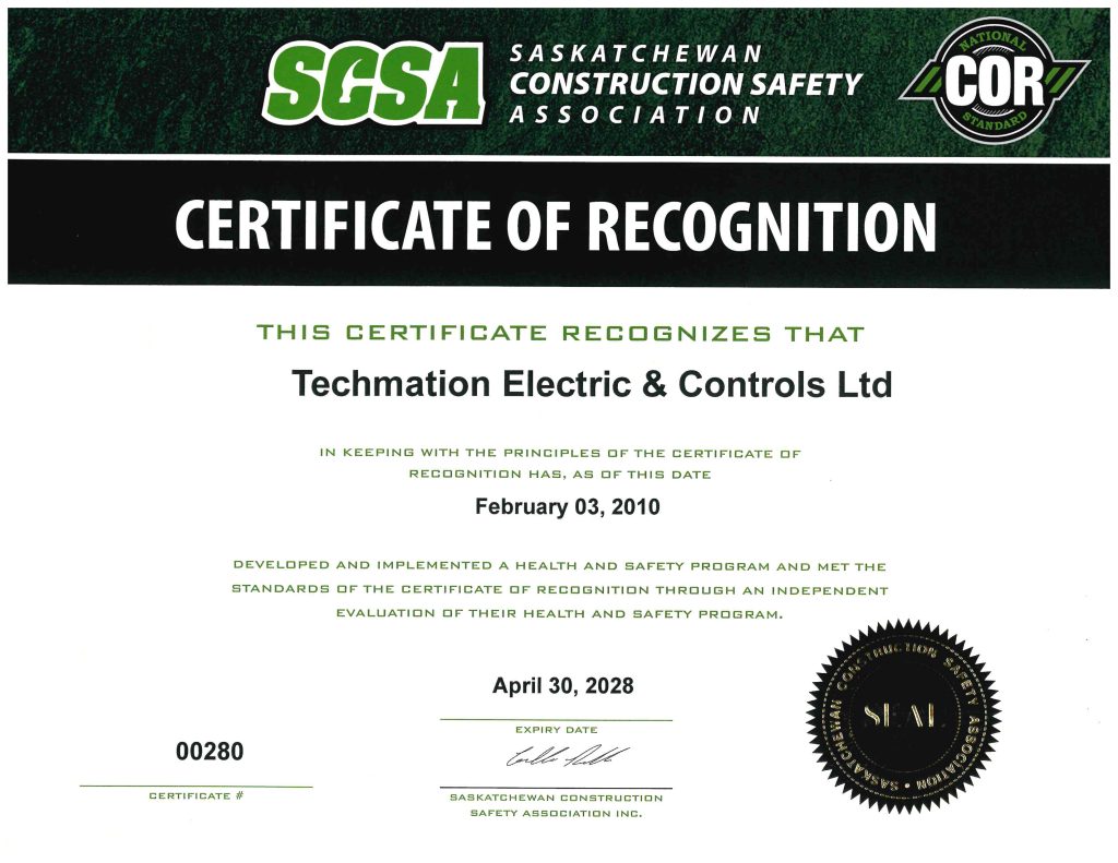 Techmation has implemented an effective safety program to protect our workers, customers, public property, the environment and all worksite properties from safety hazards. We have obtained a COR Certification with the Alberta, British Columbia and Saskatchewan Construction Safety Associations and we utilize their training services to augment our safety program and enhance our employee’s skills.